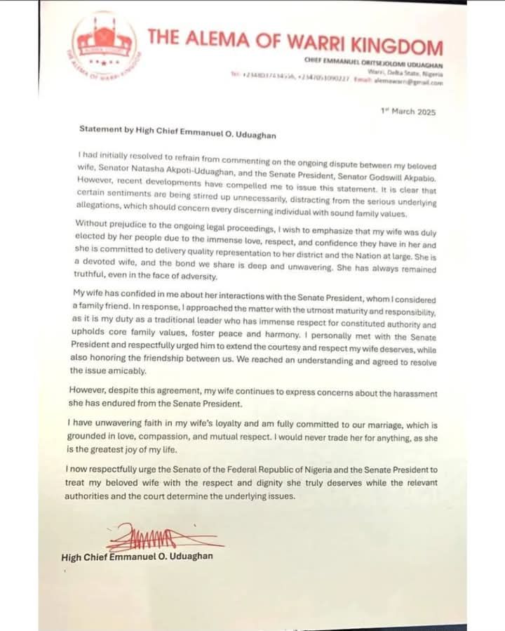 On Saturday, March 1, Uduaghan, the Alema of Warri Kingdom, also defended his wife. He said his wife Natasha had confided in him about her “interactions” with the senate president and he met with him, yet nothing has changed.