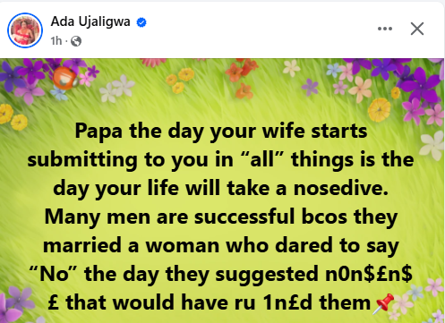 “Papa the day your wife starts submitting to you in “all” things is the day your life will take a nosedive. Many men are successful bcos they married a woman who dared to say “No” the day they suggested n0n$£n$£ that would have ru 1n£d them,” she wrote in a Facebook post on Monday.