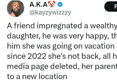Click Here to Visit Orignal Source of Article http://www.lindaikejisblog.com/2025/5/x-user-shares-story-of-alleged-disappearance-after-friend-impregnates-wealthy-mans-daughter.html