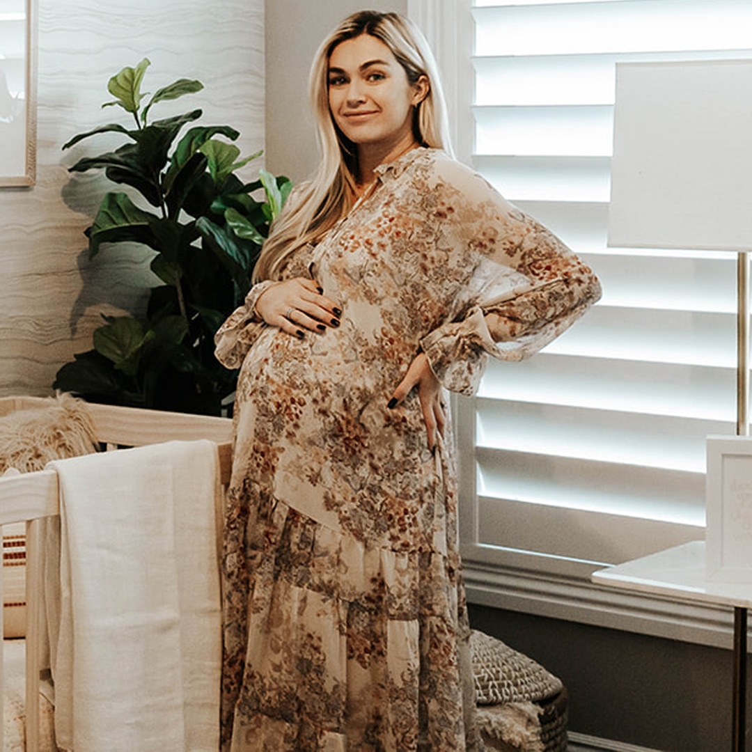“One of like the very first things that I was so excited for when I found out I was pregnant is designing our nursery,” Arnold told E! News exclusively. “We have had this room in our house for the past two years now that’s been completely empty. It’s kind of like our junk room, but I’ve always known that I wanted it to be our nursery and I was so excited for the day when I got to design it and so excited to work with Four Chairs Furniture & Design. They designed our entire home, did all of our décor, so I knew already that they were gonna be my first choice for our nursery.”